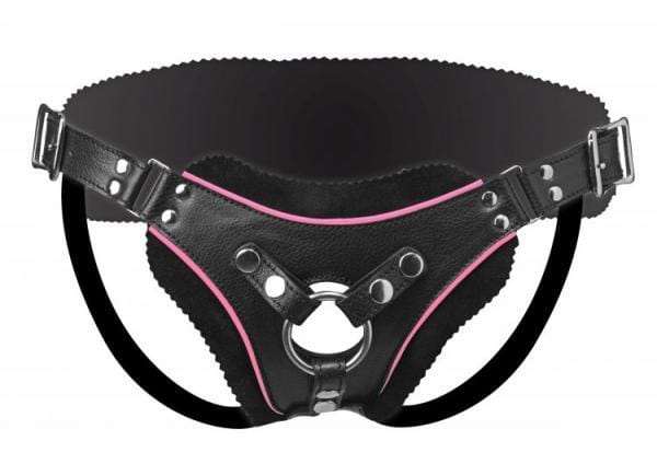 This vegan-friendly strap on harness has exciting pink accents and a low cut designed to help draw their eye and keep their attention fixed on you. The belt is fully adjustable, with buckles at the hips and rear straps for a tight fit. The back is wide for more support, and lined with soft fabric for comfort. The front has an easy snap in feature. Using one of the two included steel O-rings, you can add your favorite dildo, with multiple size options. The open-back design still leaves everything open for easy access. Measurements 43 inches in circumference at widest point, fits dildos up to 1.65 inches in diameter. Materials Leatherette, metal. Color Black. Note dildo not included.