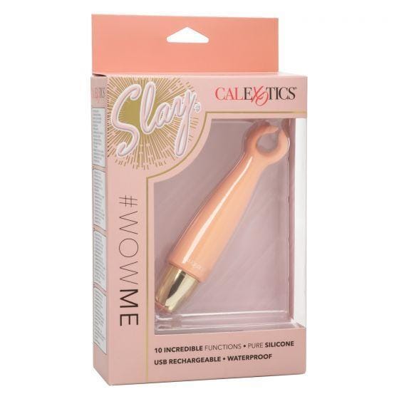 Slip the tickling Slay #WowMe into your luggage for knee-shaking pleasure wherever you go. The tickling teaser fits between your fingers to let you deliver pinpoint tantalization and thrill with flickering vibrations. Get playful while you flicker through 10 indulgent vibration, pulsation and escalation functions with the easy-touch control button. The unique flexible open design is great for exploring sensual sweet spots and delivering pinpoint stimulation with ease. Effortlessly control pure pleasure with an easy-touch silicone button and hold for 3 seconds to turn on or off. Use the smooth single button control to enjoy up to 70 minutes of vibrating pleasure. Charge up your passion in only 1.5 hours by plugging the provided USB cable into the self-sealing charging port on the back of the massager. Materials: Silicone ABS Plastic / Metallic Plating Waterproof Travel Lock USB rechargeable – cord included Charge Time- 90 minutes Max Run Time – 70 minutes Dimensions: Overall Length – 5.25 inches Insertable Length – 4 inches Width – 1 inch One Year Warranty